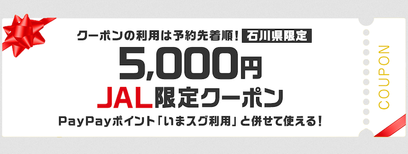ヤフーパック(JAL便)では、現在、羽田-小松便(JAL)利用&石川県内宿泊で使える「5,000円OFFクーポン」を超絶素敵に配布中💖