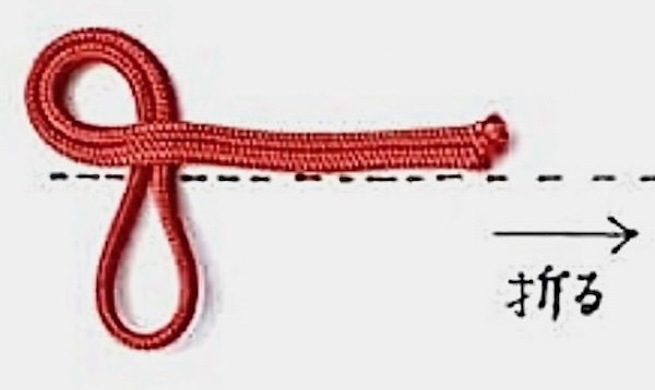 ⑥紐の折り目を左後方へ倒し、5.でできた輪に下から通し、上へ引っ張りあげる。