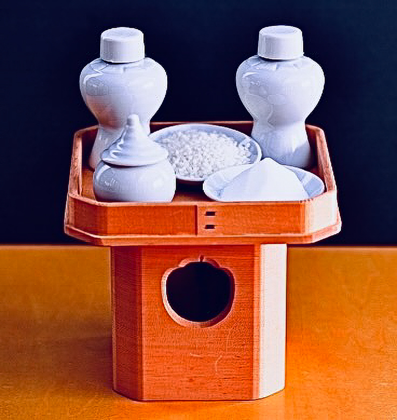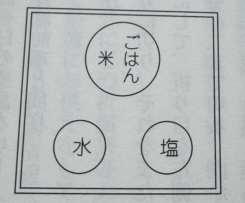中座に、ごはんor洗米を置き、その手前左側にお水、手前右側にお塩を素敵に置く。