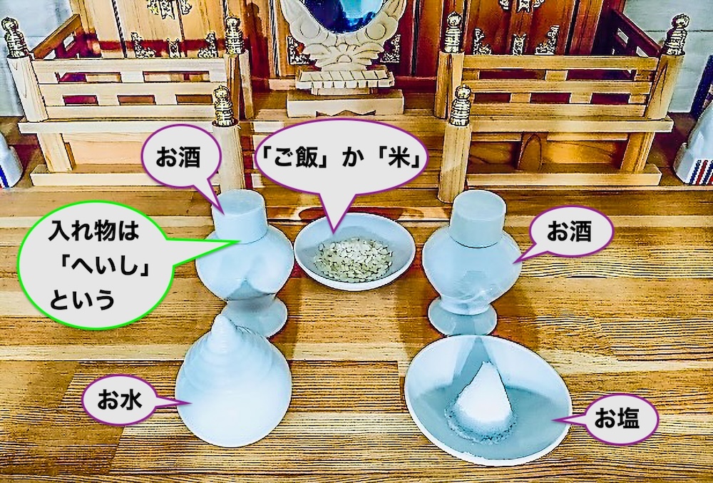 供物は、上記三方のほか、折敷(おしき/四角いお盆)に乗せてお供えするのが正式とされるも、上掲写真のように陶器の皿や瓶子(へいし)に入れてお供えしても構わない。